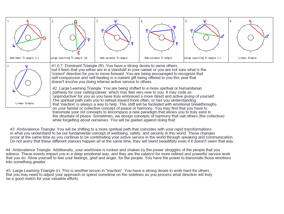 If you’re curious about where these descriptions like “Learning Triangle” come from, they are a system of aspect figures used in Huber Astrology. I use Huber Astrology because it is the most aligned with psychotherapeutic orientation. This system provides the astrological language and technique to work very well with client’s self-growth and deep psychological knowingness. If you are interested in getting a Solar Return reading for this year, you can click on the Book Now button above. This technique is most appropriate for the Focused Astrology reading option available as a 60 minute or 90 minute appointment.