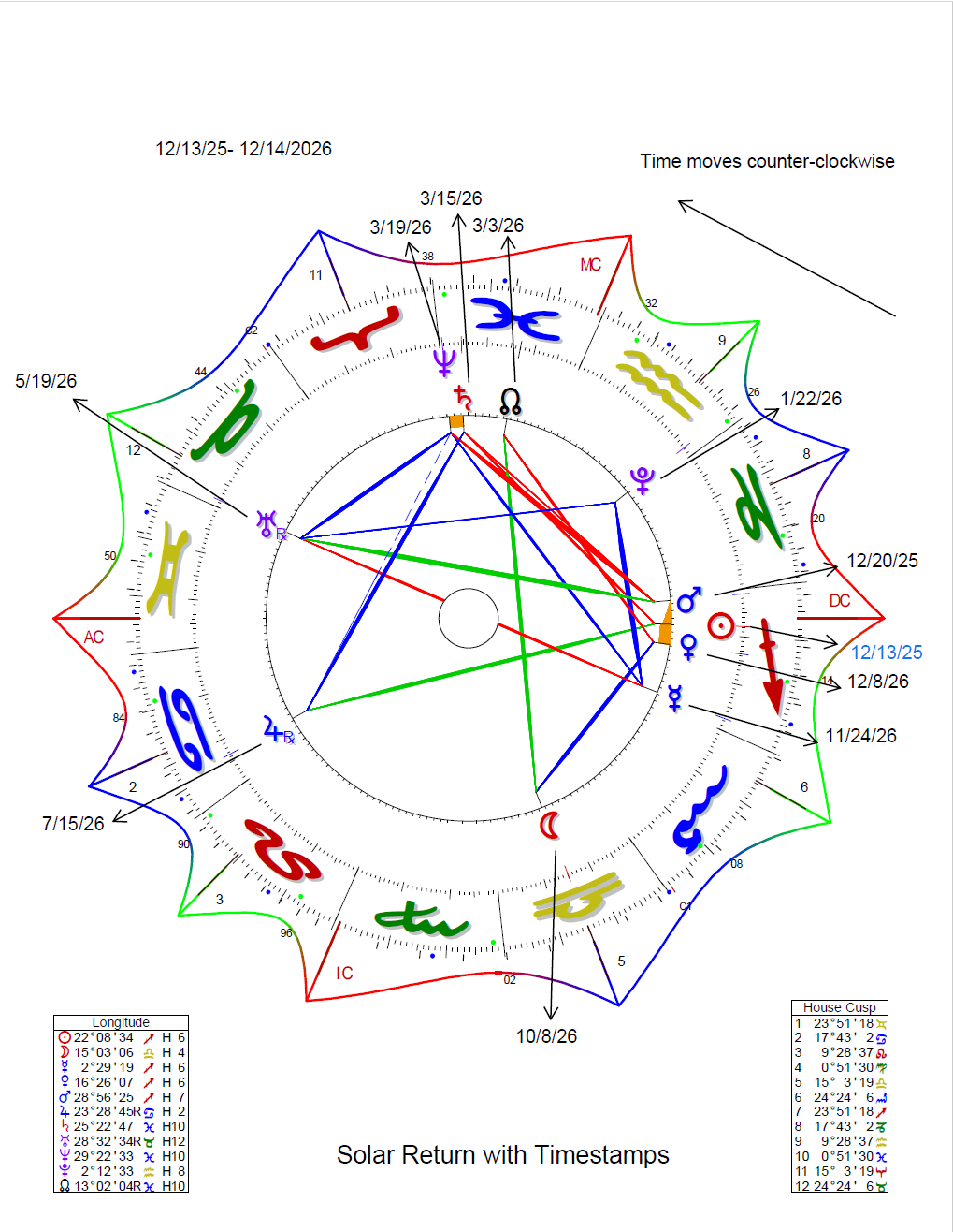 Let’s say we read the description for the first aspect figure #1 Dominant Triangle and we want to know when this archetypal experience will play out. This aspect figure involves the Sun, Saturn, and Jupiter, We’ll go and take a look at the Solar Return Chart with Timestamps to find those specific planets. In this Solar Return chart, the Sun will be activated on December 13, 2025, Saturn will be activated on March 15, 2026, and Jupiter will be activated on July 15, 2026. I encourage clients to do some journaling around and after those dates occur. When you experience one activation in isolation, it might feel like nothing is really happening. But after you experienced more or all of the activation dates, the theme of what Source is trying to teach you will become evident in the experiences you have had.